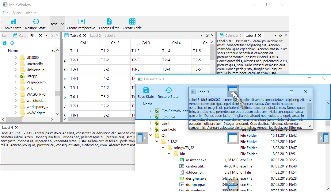 Qt Advanced Docking System lets you create customizable layouts using a full featured window docking system similar to what is found in many popular integrated development environments (IDEs) such as Visual Studio.